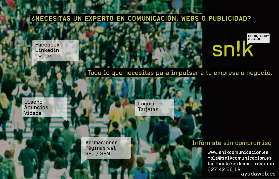 En Snik Comunicación te ayudamos a dar visibilidad a tu empresa. Desde la publicidad, la redacción creativa (coprwriting), el diseño original, el posicionamiento SEO, campañas de publicidad SEM en Google Ads, YouTube, y redes sociales.... Cuenta con profesionales de la creatividad, la publicidad, el periodismo, el diseño, la programación, la optimización SEO, el community management, la usabilidad, el vídeo, la animación... Que han pasado por agencias multinacionales, tanto locales como del mercado europeo, para estar hoy a tu lado. Del lado de tu éxito. Seas grande, mediado, mini o pequeño... somos tu agencia online.