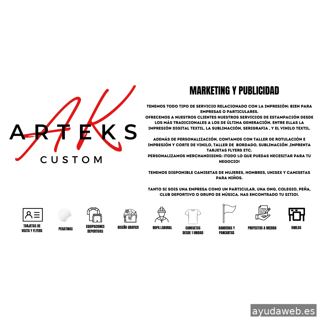 Tenemos todo tipo de servicio relacionado con la impresión: bien para empresas o particulares. Ofrecemos a nuestros clientes nuestros servicios de estampación desde los más tradicionales a los de última generación. Entre ellas la impresión digital textil, la sublimación, serigrafia , y el vinilo textil. Además de personalización, contamos con taller de rotulación e impresión y corte de vinilo, taller de bordado, sublimación ,imprenta tarjetas flyers etc. Personalizamos merchandising: ¡todo lo que puedas necesitar para tu negocio! Tenemos disponible camisetas de mujeres, hombres, unisex y camisetas para niños. Tanto si sois una empresa como un particular, una ONG, colegio, peña, club deportivo o grupo de música. has encontrado tu SITIO!.