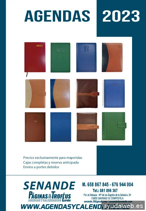 Venta de Agendas y Calendarios 2023 Fabricantes de Agendas y Calendarios Diseñamos, fabricamos y personalizamos agendas en tapa dura, simil piel, con broche, anillas, con el interior troquelado, así como calendarios personalizados y venta de faldillas en distintos tamaños e idiomas. Imprenta offset y digital. Puede contactar en: europrint@senande.com diseno@senande.com senande@senande.com senande.59@gmail.com
