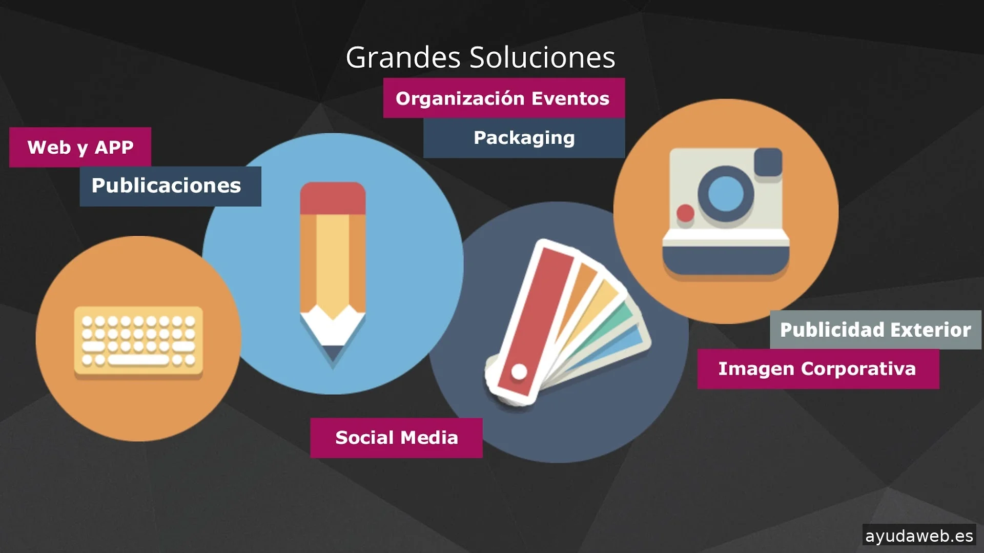 Nos dedicamos a desarrollar imagen corporativa, desde cero, papelería, material corporativo, merchandising entre otros productos. Diseñamos y producimos todo tipo de materiales en papel como folletos, dípticos, revistas, flyers, cartelería, etc; También estamos enfocados al packaging, PLV, señalética interior y exterior, vinilos, rótulos, publicidad exterior,etc. Además de estos materiales organizamos eventos y stand para ferias. Por último, contamos con gran experiencia en lo digital, es decir, creación de página web, APP, campañas SEO y SEM, social media, banner, etc.