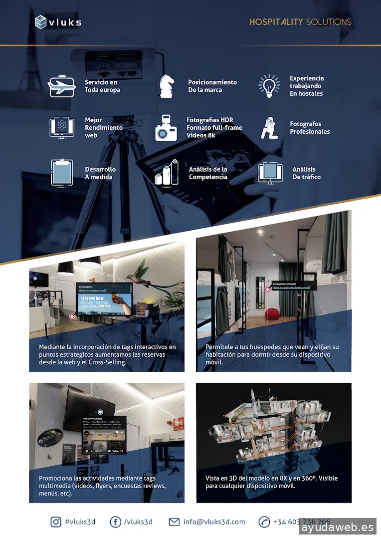 Somos proveedores de fotografia y expertos en visualización. Planteamos soluciones 3D y VR de alta calidad y material de marketing para Hoteles, Hostels e inmuebles. Nuestros tours virtuales son lo más cerca que estarás de experimentar un entorno o espacio sin necesidad de estar allí. Proporcionamos uno de los únicos sistemas de captura de realidad todo en uno que también proporciona planos de planta, tags multimedia, modelo 3D, video y realidad virtual. Contamos con un equipo de profesionales basado en Madrid, España el cual está equipado con la última tecnología del mercado y virtualizamos tus espacios para que puedas mostrarlos junto con tus servicios o eventos.