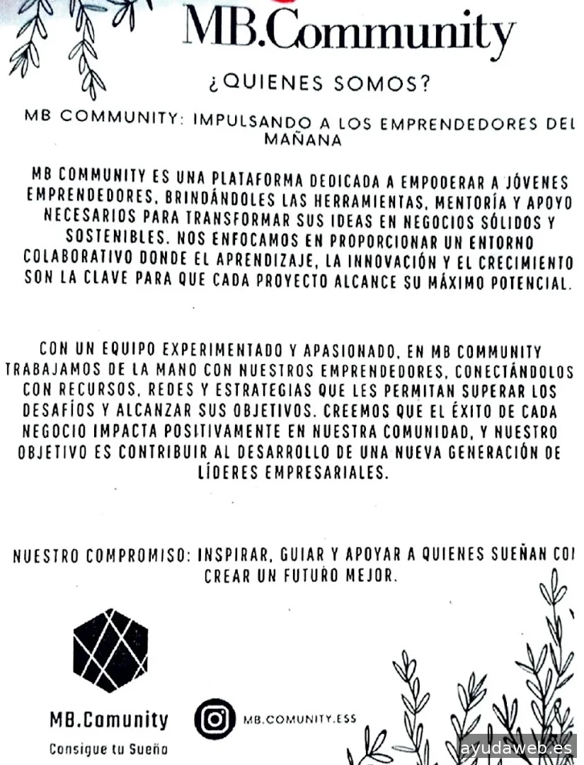 MB,Community es una empresa innovadora que impulsa a personas, proyectos y negocios con soluciones en estrategia digital, comunicación y tecnología. Ofrecemos servicios de asesoría, gestión de redes sociales, diseño corporativo, formación digital y apoyo empresarial, adaptados a cada cliente. Nos distingue la cercanía, la creatividad y el compromiso con los resultados. Trabajamos tanto presencial como online, siempre con un enfoque moderno y flexible. 🚀