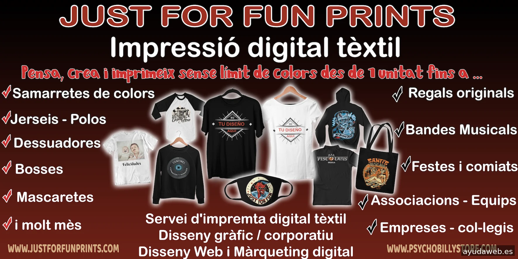 PIENSA , CREA , IMPRIME ! En Just for fun prints podrás dar vida con todos los colores que desees en camisetas, sudaderas o en una gran variedad de prendas desde una sola unidad hasta el límite que nos pongas ! También nos puedes encargar tús productos de manera directa ya sea para tú empresa , tú asociación, despedidas del soltero o para venderselo a tú comunidad. No dudes en contactar con nosotros si tienes alguna duda y esperamos que la experiencia de compra sea lo más fácil posible . Visita nuestra web o ven a vernos directamente: Just For Fun Avda Puerto Rico 25 local 1 08397 Pineda de mar Barcelona Just for fun prints !