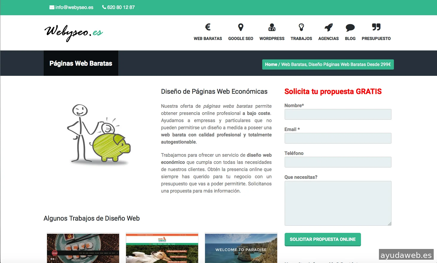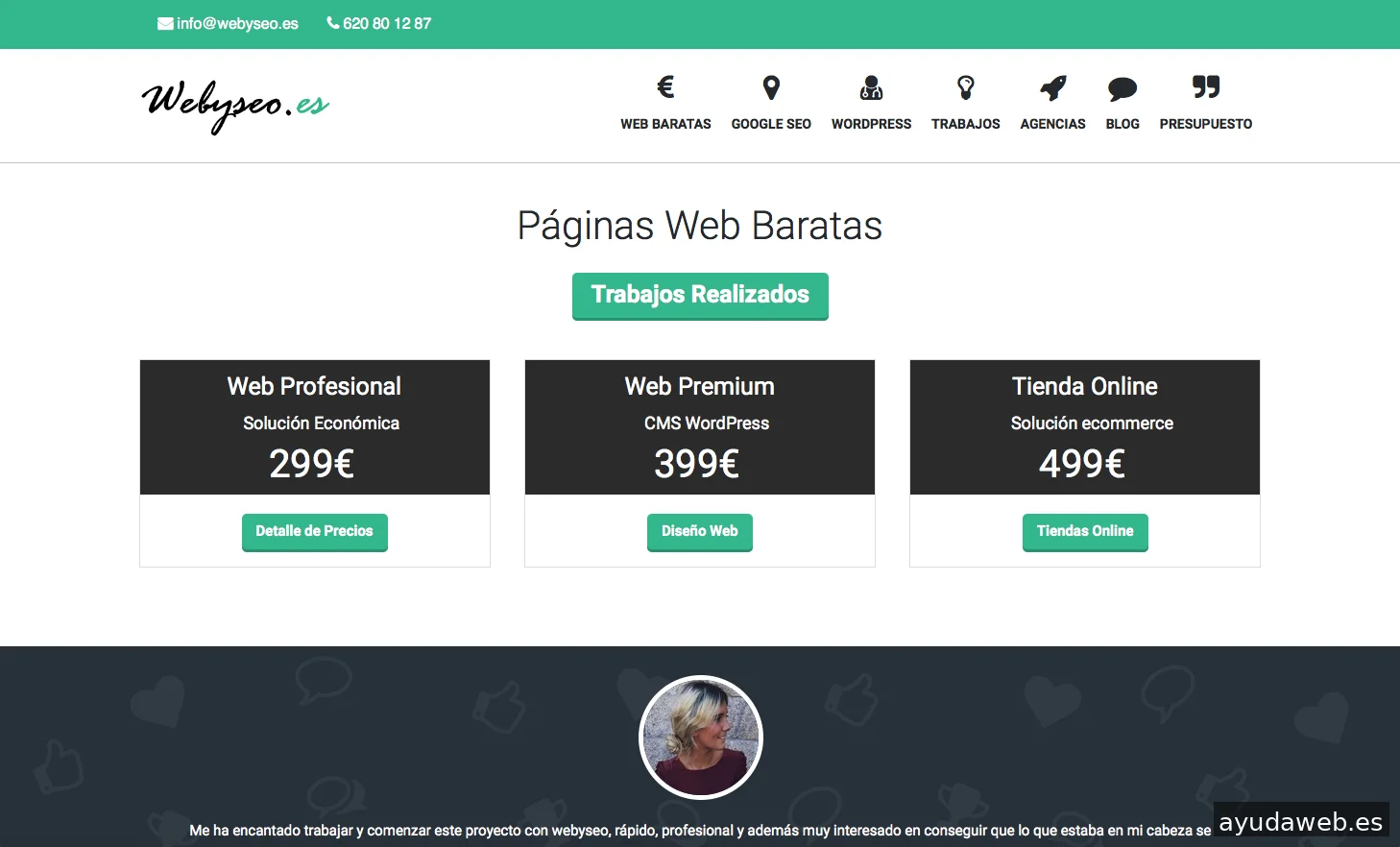 Webyseo ubicada en Sabadell está dirigida a PYMES y Autónomos que necesitan expandir su negocio y no quieren hipotecarte para poder tener su propia página web, ofrecemos diseño web de calidad al mejor precio. No importa cuál sea tu sector de actividad, en Webyseo nos adaptamos a tus necesidades y te ofrecemos la posibilidad de iniciar cualquier proyecto online con todo lo que necesitas al mejor precio. Además para que obtengas el mayor rendimiento a un precio económico en Webyseo nos comprometemos a entregar nuestras páginas web en menos de 2 semanas, con un aspecto profesional y a un precio realmente competitivo. Nuestros clientes nos avalan, comprueba nuestros trabajos realizados y no te lo pienses mas…somos tu mejor aliado!