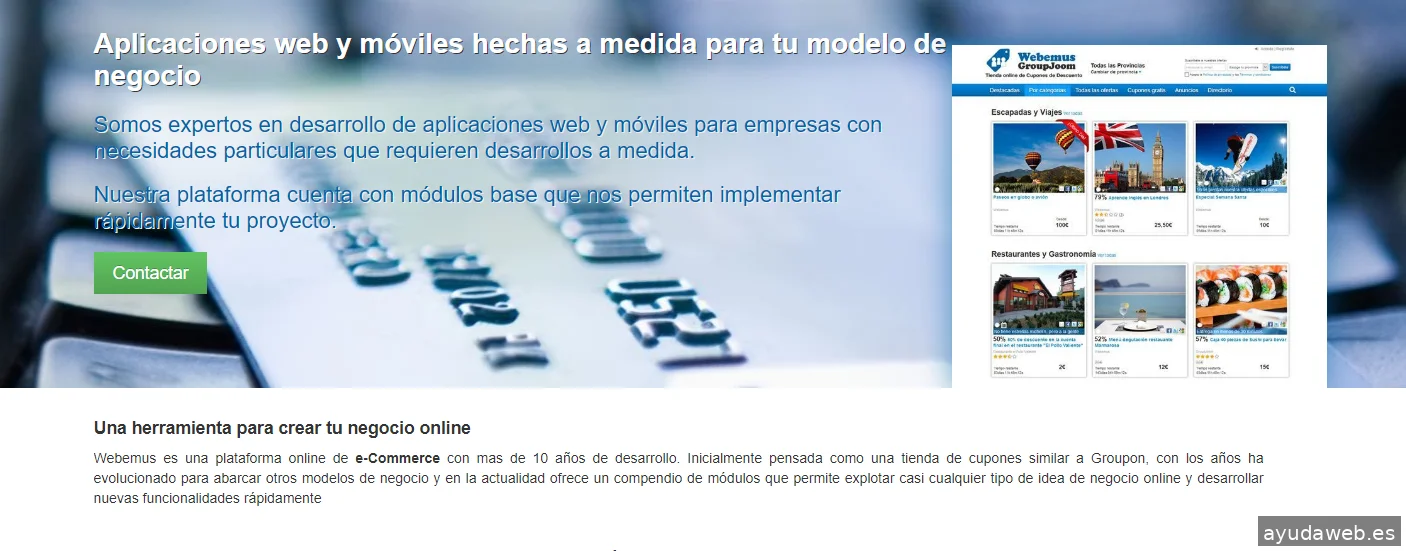 Aplicaciones web y móviles hechas a medida para tu modelo de negocio. Somos expertos en desarrollo de aplicaciones web y móviles para empresas con necesidades particulares que requieren desarrollos a medida. Nuestra plataforma cuenta con módulos base que nos permiten implementar rápidamente tu proyecto. Una herramienta para crear tu negocio online Webemus es una plataforma online de e-Commerce con mas de 10 años de desarrollo. Inicialmente pensada como una tienda de cupones similar a Groupon, con los años ha evolucionado para abarcar otros modelos de negocio y en la actualidad ofrece un compendio de módulos que permite explotar casi cualquier tipo de idea de negocio online y desarrollar nuevas funcionalidades rápidamente.