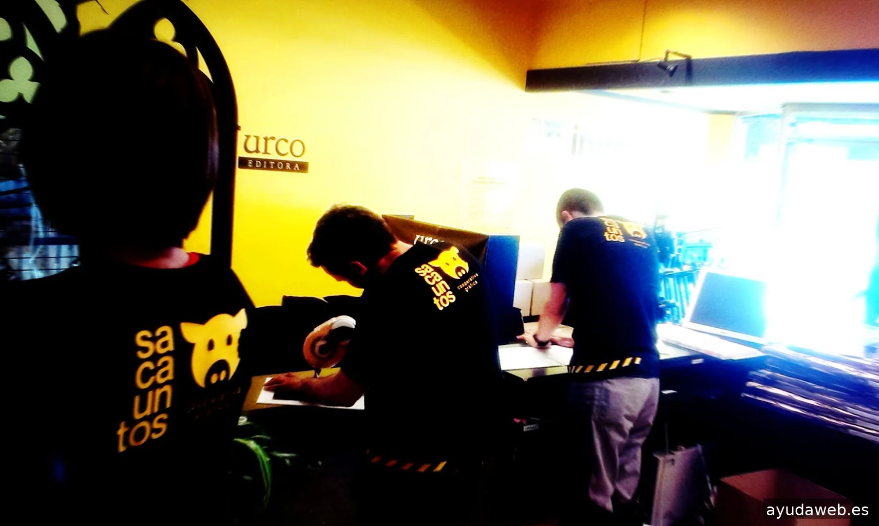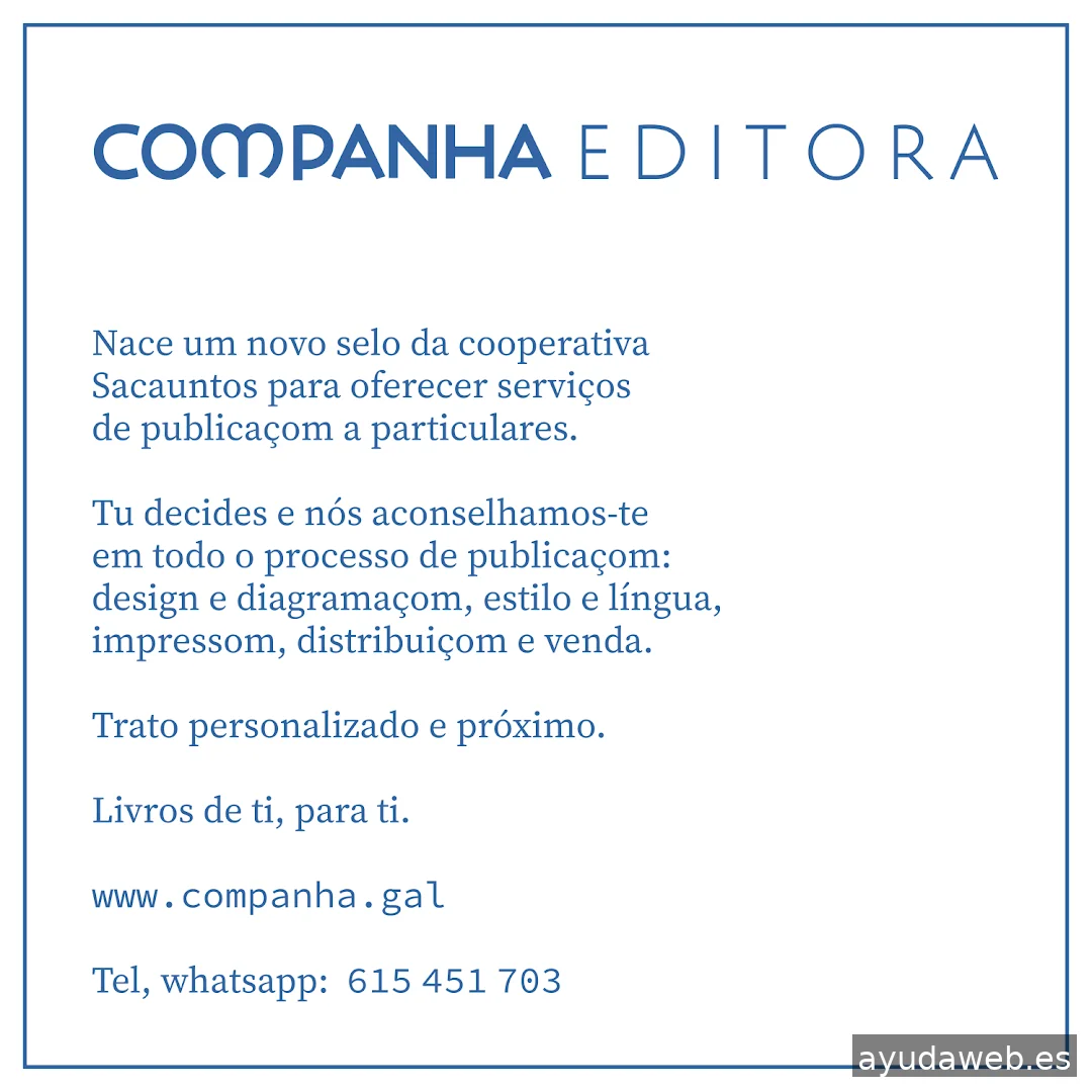 Quem somos? Sacauntos é uma cooperativa gráfica que oferta serviços de desenho gráfico e web e impressom em grande e pequeno formato. Fazemos desde livros e revistas a cartóns de visita, cartazes para exterior, lonas de grande formato ou papelaria corporativa. Desenhamos logótipos, webs inteiras, fazemos ilustraçom e infografismos e diagramamos as tuas publicaçons. Ofertamos serviços de autoediçom para autoras independentes que escolhem a via de publicarem o seu próprio trabalho. Gerimos o depósito legal e o ISBN, e ofertamos a diagramaçom do interior do livro e também o desenho de capa, ou imprimimos o que já nos traias em PDF. Temos uma oferta de serviços editoriais (correcçom, traduçom, estilo) que talvez também che poida interessar.