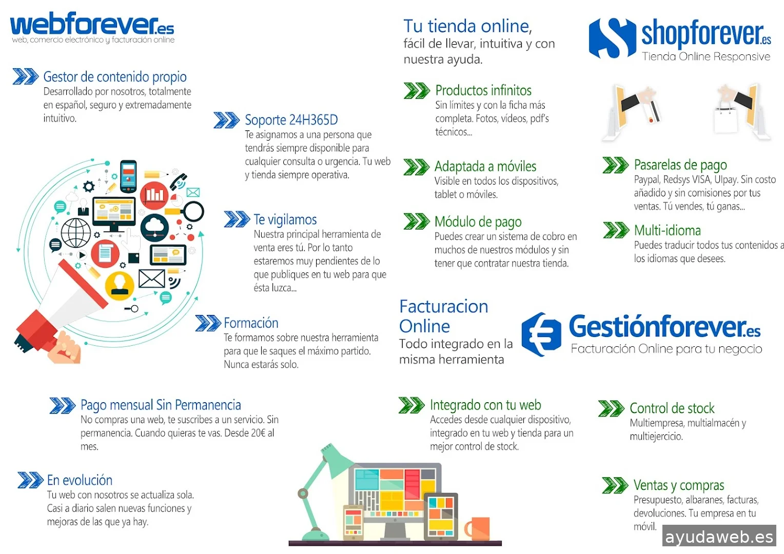 En una misma herramienta un gestor de contenido para realizar tu web, Tienda online y software de facturación Online. Todo desde la misma plataforma. Trabajamos por pago mensual sin permanencia. Te ayudamos con formación por videoconferencia o bien puedes contratar los servicios de un distribuidor local con soporte para Redes Sociales.